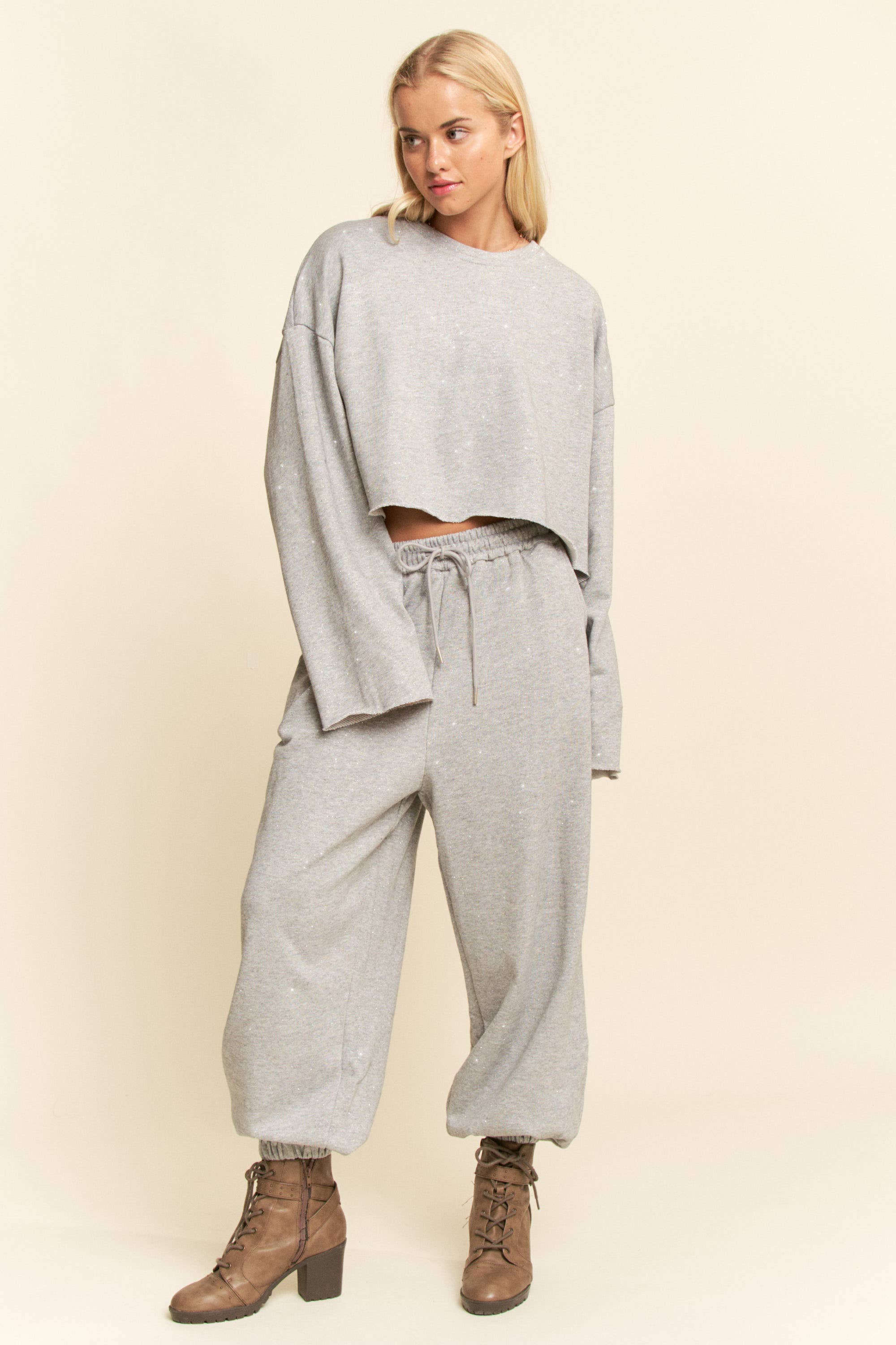 Featuring a cropped long-sleeve top and relaxed joggers, this ultra-soft fleece style is detailed with subtle speckling for a modern twist. Perfect for lounging or casual outings, it blends comfort and style effortlessly.