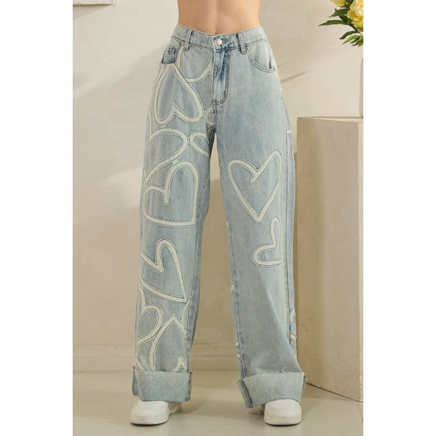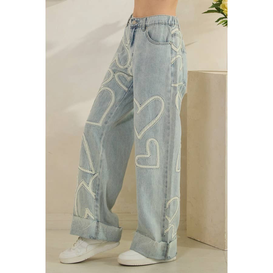 HEART PATCHWORK DETAIL DENIM JEANS - IMPORTED - MINERAL WASH DETAIL - RELAXED FIT - TRUE TO SIZE - MODEL WEARING SIZE "S" - FABRIC CONTENT: 100% COTTON