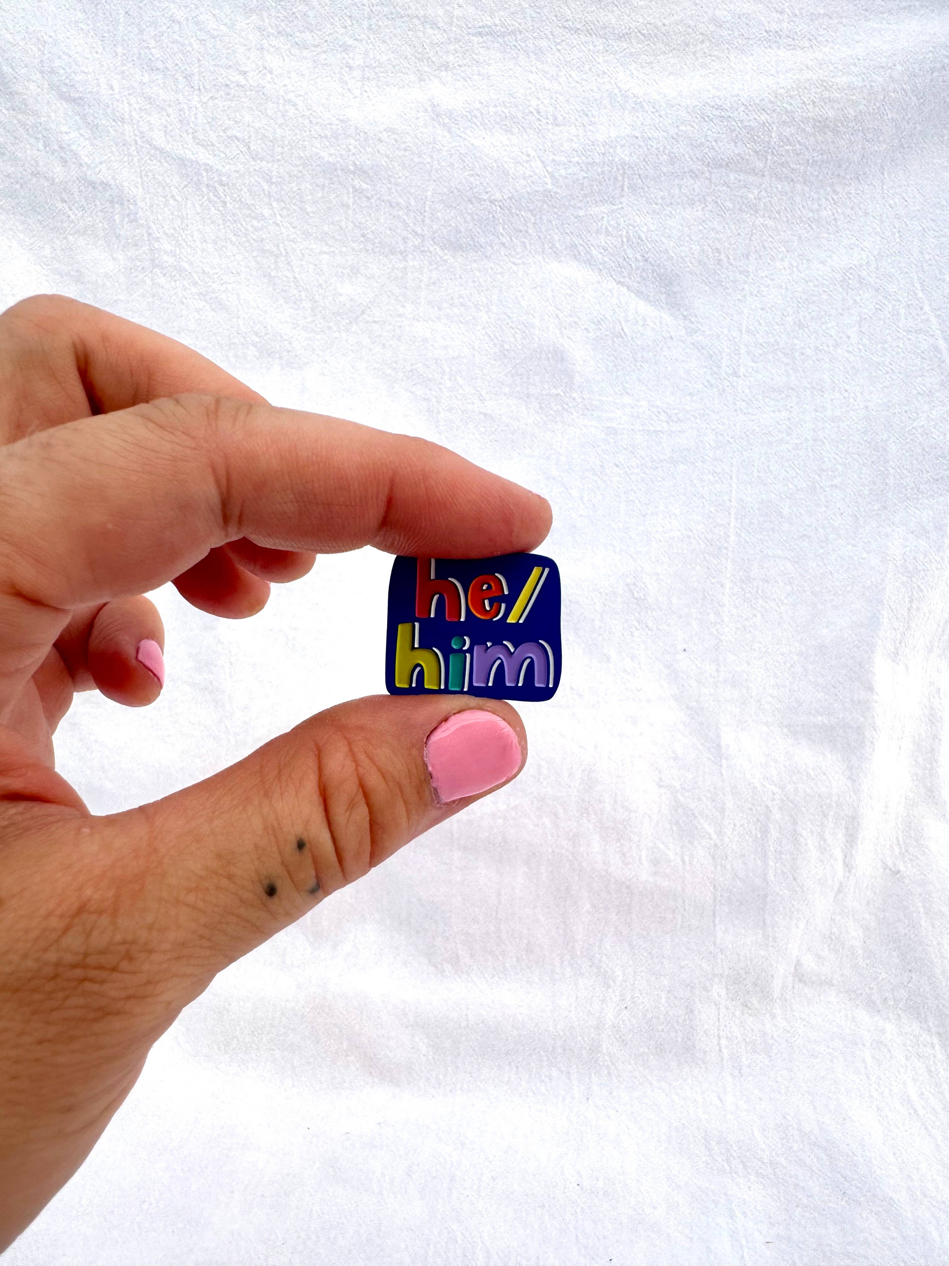 Pronouns matter, and pins are a great way to display them! These pins are 1" wide and have one post on the back. Looks great on your shelves or on your employees' nametags. Original design by Anna Parade. 🌈