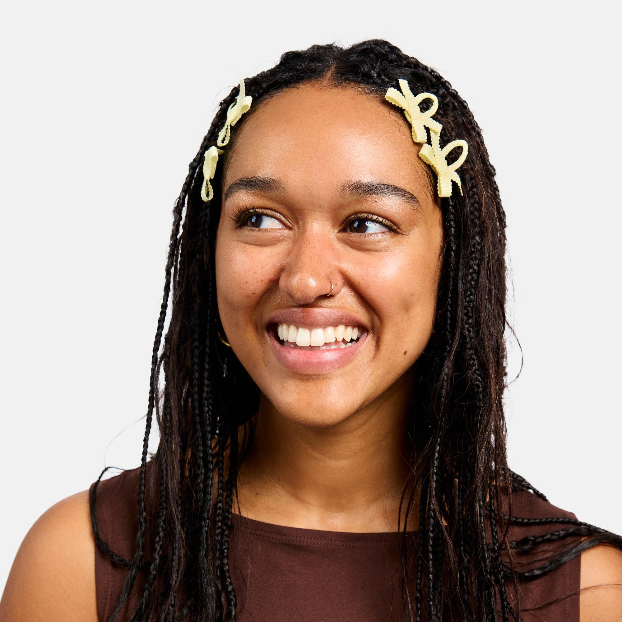 Four mini metal snap clips wrapped up in ribbon, topped with a bow. Perfect for all hair types and textures. Metal hardware is lead and nickel-free. Measures 1.75"L x 1.5"H x 0.25"D Color: light yellow, silver-tone hardware