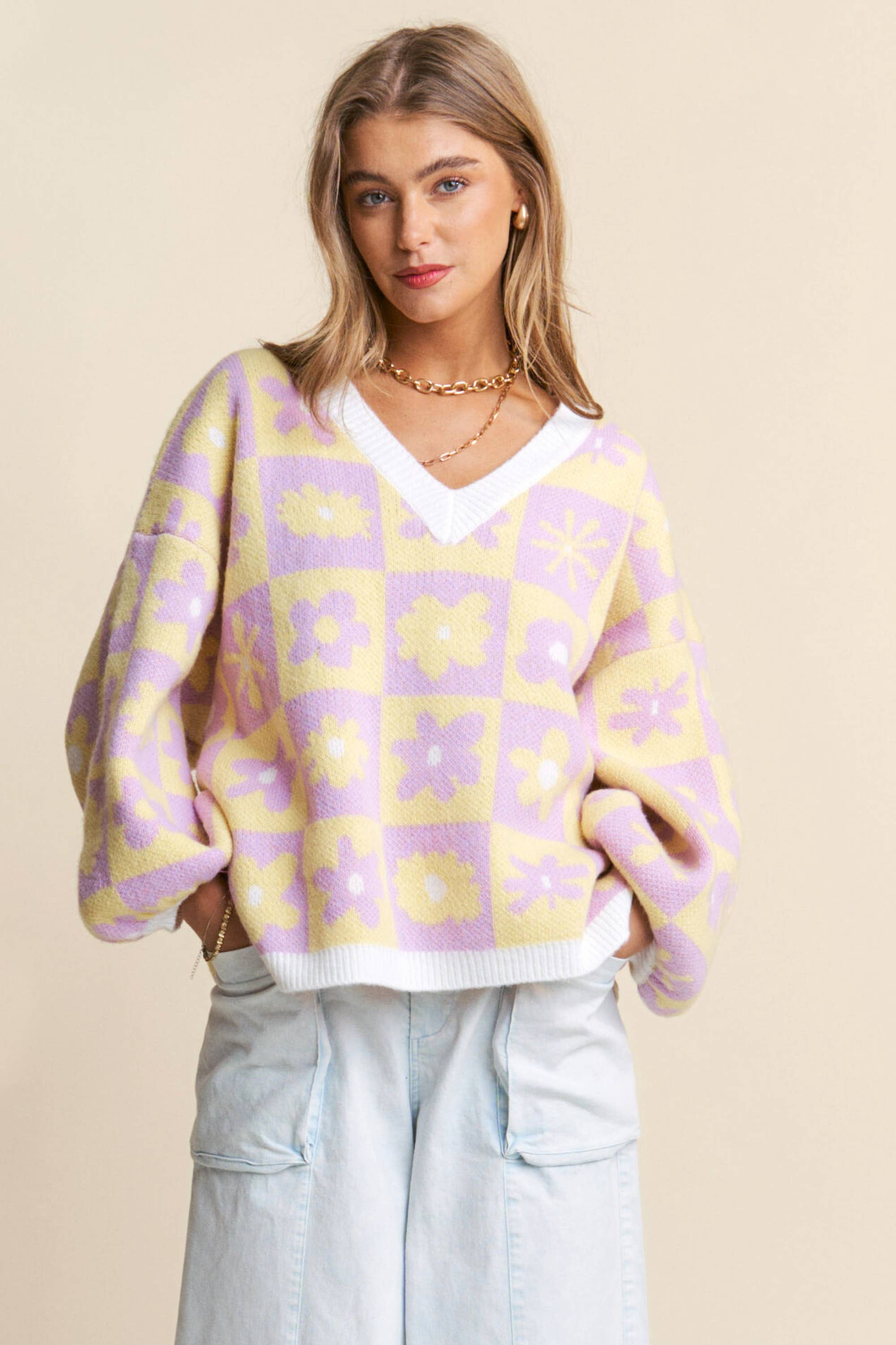 Floral Checkered Knit V Neck Sweater S-L / 1X-3X