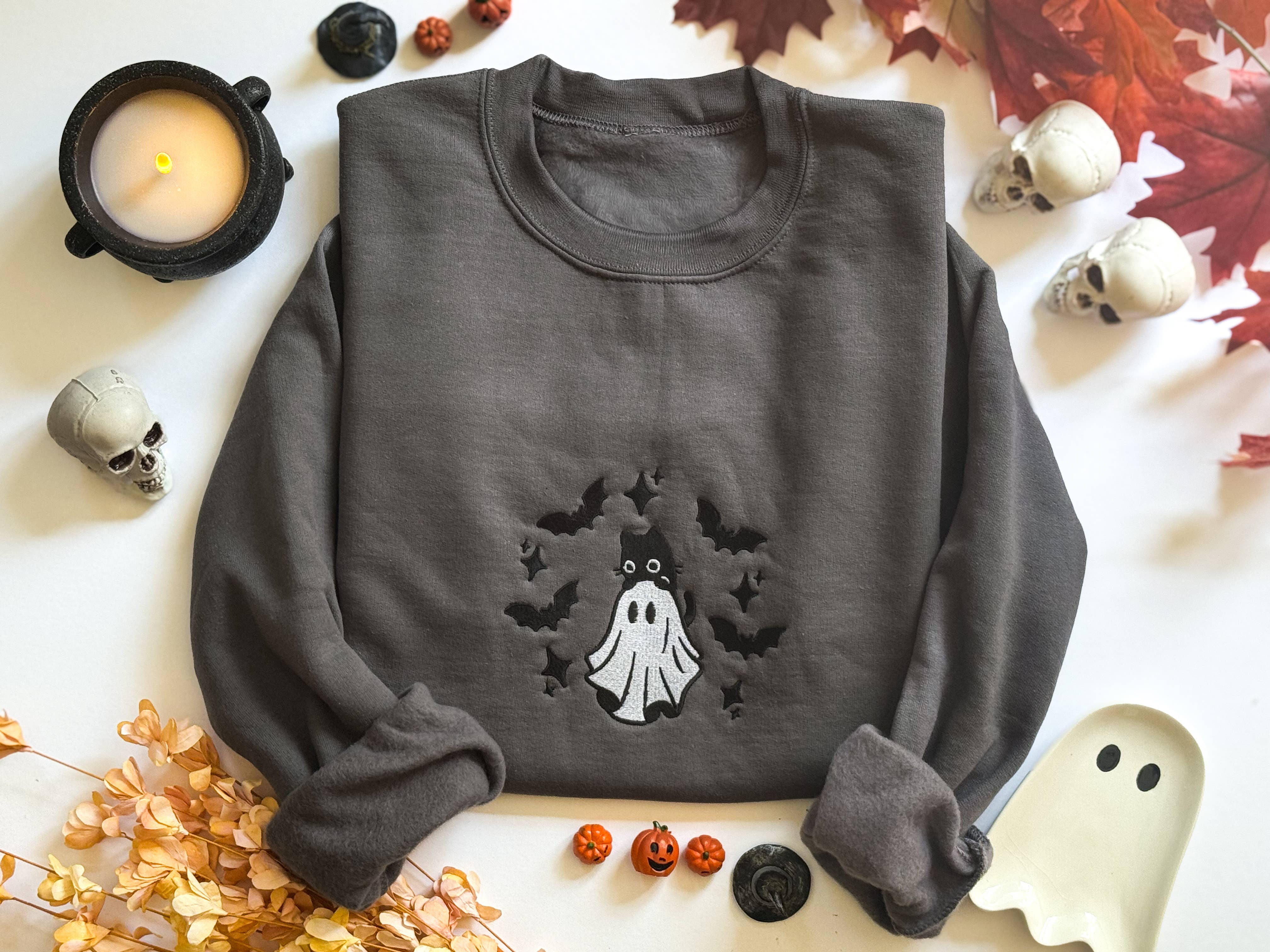 Get spooky and cozy with this embroidered Halloween sweatshirt featuring a ghost surrounded by fluttering bats. Soft, comfy, and perfect for chilly autumn nights, haunted hayrides, or sipping cider with scary movies. A festive yet wearable fall staple and the ultimate gift for Halloween lovers who adore a spooky-cute aesthetic.