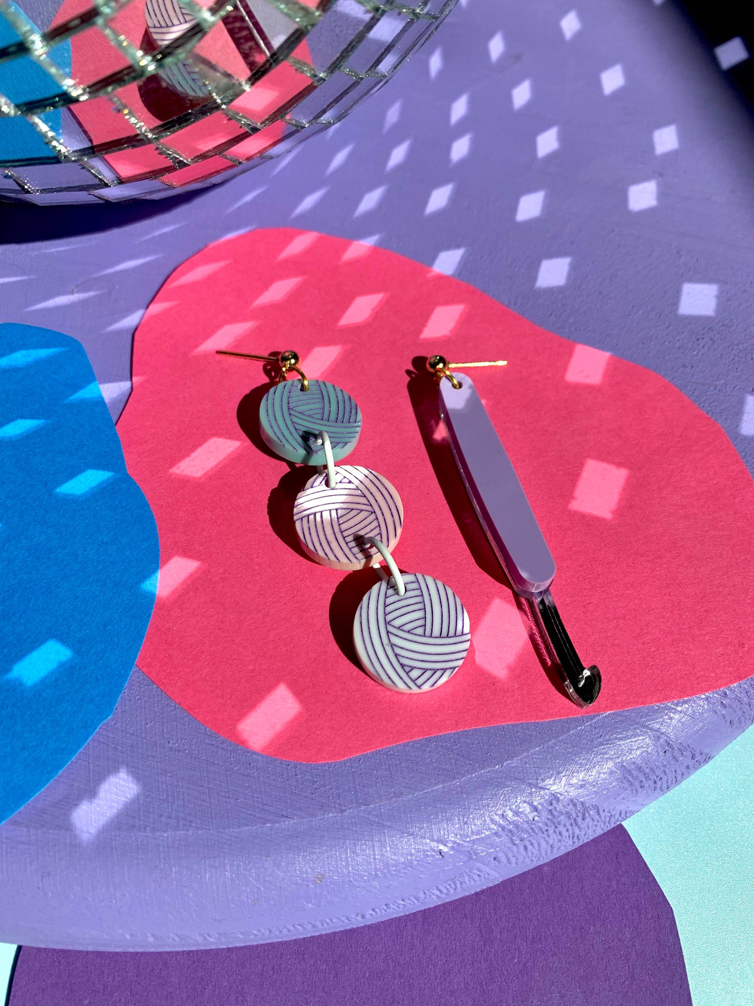 Crochet earrings! These mismatched earrings feature a crochet hook and three balls of yarn.