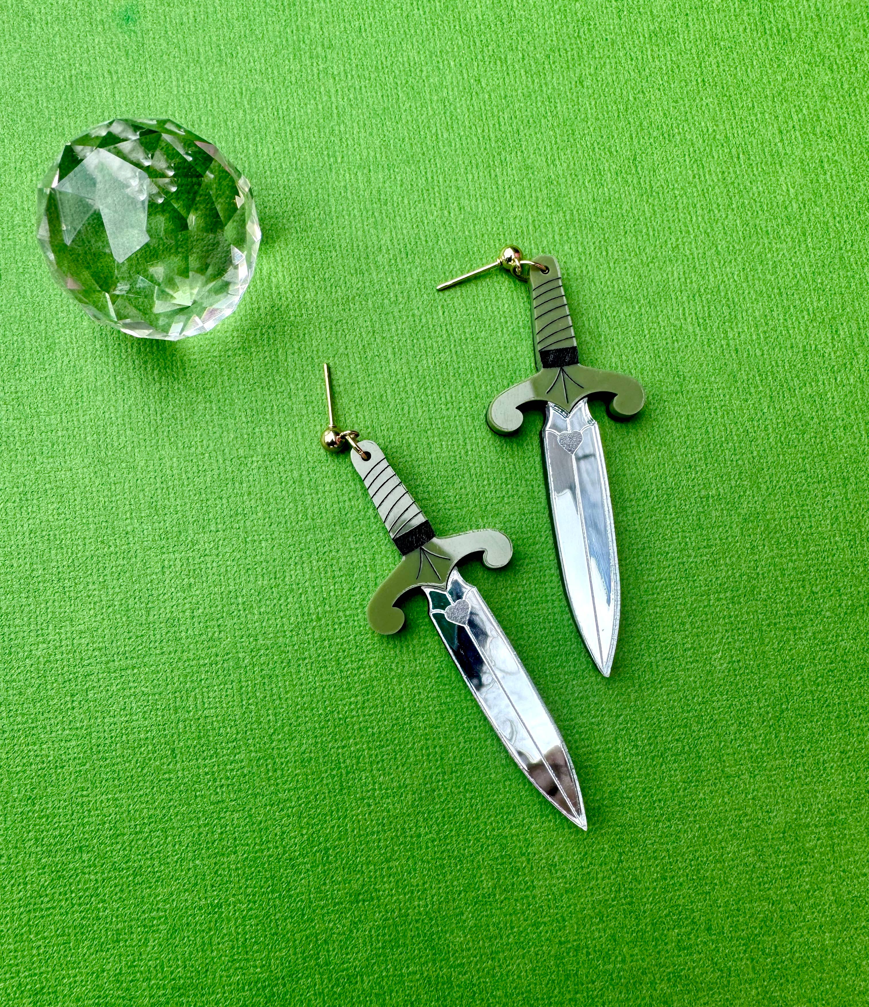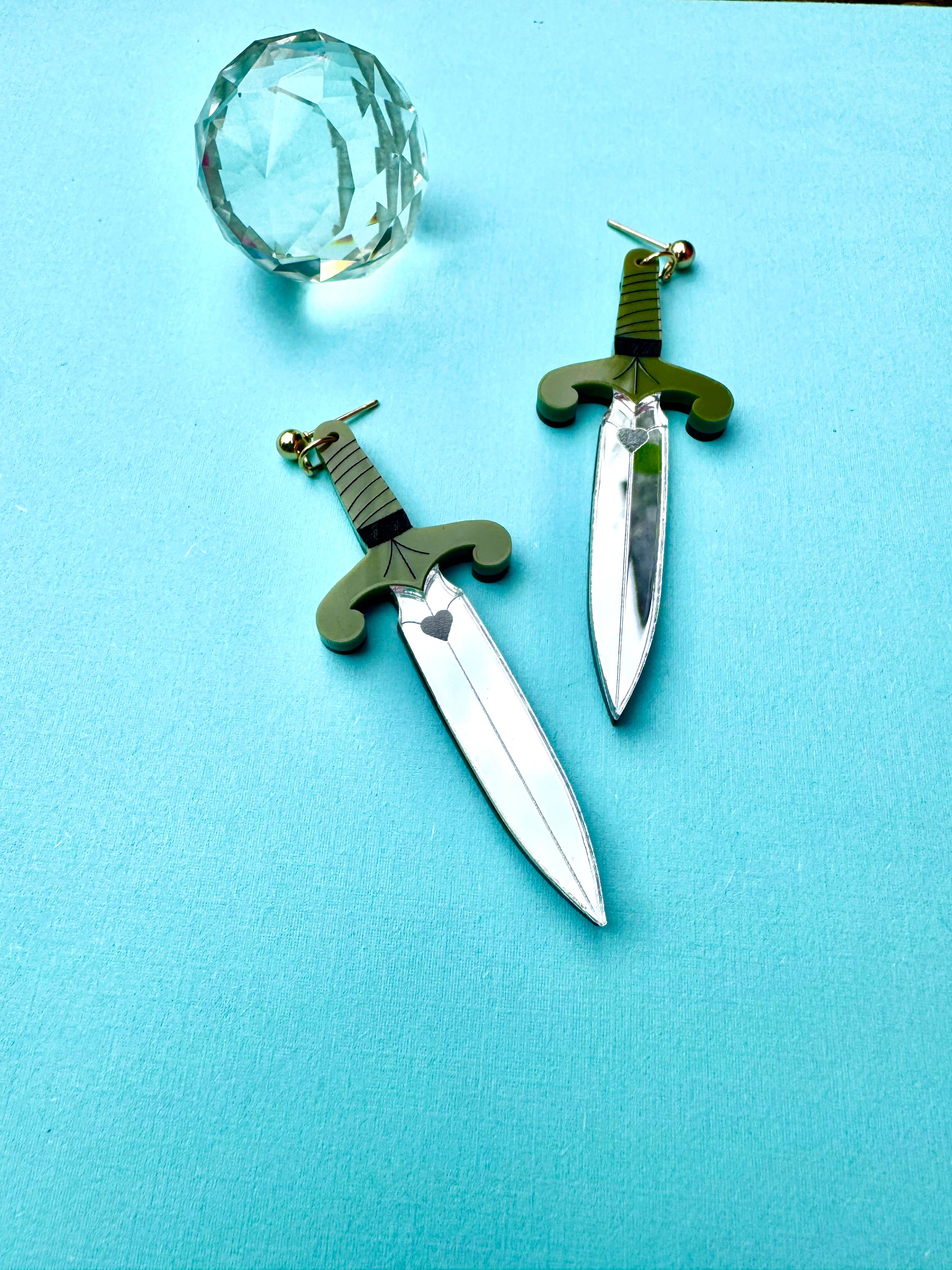 Looking sharp! Ren Fair core! Made from an original design and laser-cut acrylic. Each piece is handmade, so slight differences can be expected. These are finished with hypoallergenic, anti-tarnish gold-plated earring posts. Earrings arrive set on a Not Picasso branded display card.* (5.5" x 4.2") *Display card may be switched to a branded small card (2” x 2”) by request.